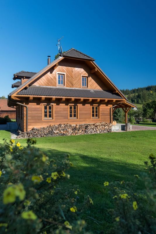 Stavební systém: roubená konstrukce, lepené hranoly — smrkové dřevo obložené modřínem