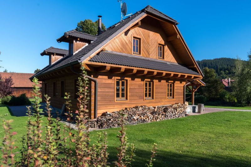 Měli pozemek a věděli, který typ domu budou stavět, na řadu přišla otázka stavebního materiálu. „Vím, že většina roubenek se staví ze smrkového dřeva, ale přemýšlel jsem o tom, že bychom dům postavili z modřínových hranolů. Ovšem sehnat je v těchto průměrech a délkách je obrovský problém. Nakonec mě osvítila myšlenka, že bychom mohli použít lepené hranoly v kombinaci smrk — modřín. Znal jsem firmu, která byla schopná takové hranoly vyrobit, kdysi jsem pracoval na šachtě a vzpomněl jsem si, že se lepené hranoly v dolech používají."
