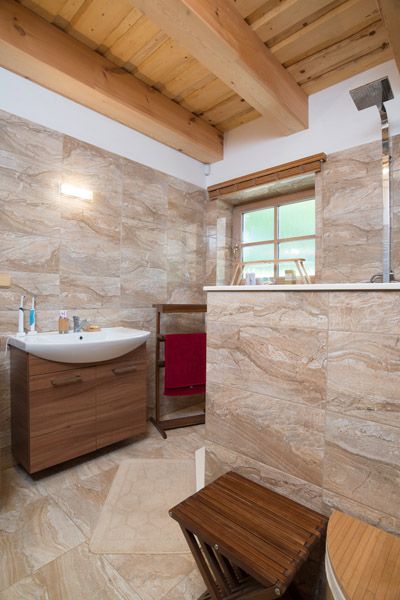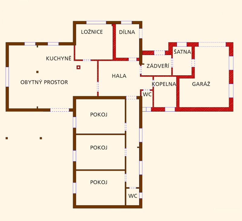 Velký obytný prostor, který Václav s Jindřiškou užívají po většinu dne, je orientován tak, aby do něj šlo slunce po celý den. V zadním traktu, který je na rozdíl od přední části domu zděný, je situována koupelna a garáž. Zděné stěny jsou obloženy světlým pískovcem, jímž je vydlážděn též venkovní prostor kolem terasy. Pískovec se svým odstínem s cedrovým dřevem dobře doplňuje.