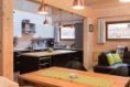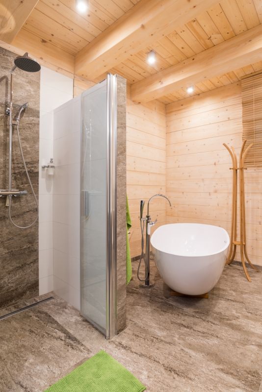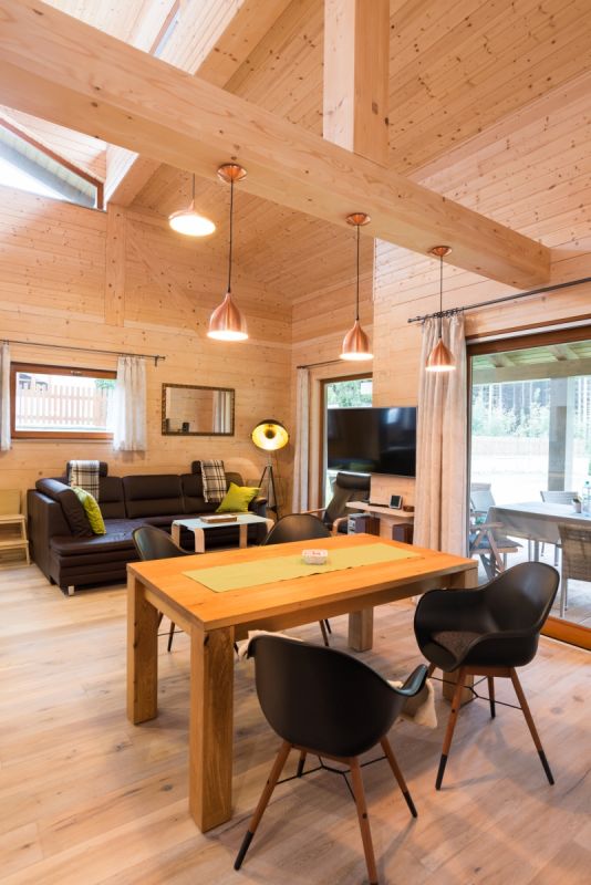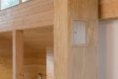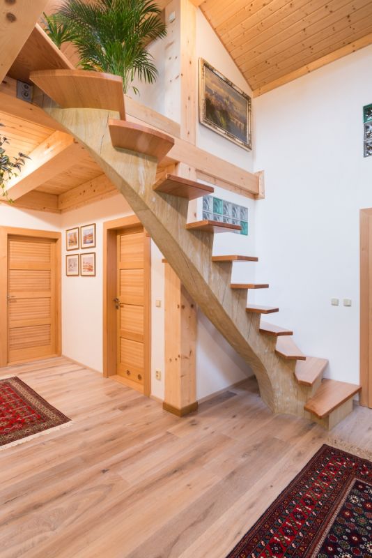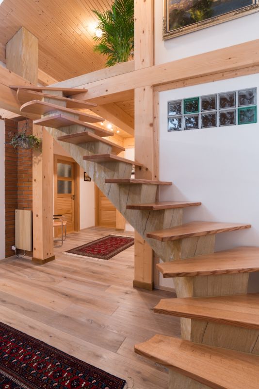 Hned při vstupu do hlavního obytného prostoru jsem si všimla masivních silných trámů. „Trámy jsou v modulu 240 × 240 mm, všechny včetně sloupů a průvlaků jsou staticky předimenzované, ale záměrně," doplňuje Oldřich, „jsou spíše dekorativní, domem prochází ztužující vazník v délce 15 metrů, jednotlivé části nosné konstrukce jsou spojovány na čepy, bez šroubů, stropní trámy jsou také začepované, tam jsou čepy ve tvaru písmene V." Roubenka je postavena z lepených trámů ze smrkového dřeva, spodní část roubení je natřena speciální vodou ředitelnou lazurou s bílým nádechem. Její velkou předností je omyvatelnost běžnými čisticími prostředky, byla tedy použita jak na nátěr stěn koupelny, technické místnosti a šatny, tak i na stěny za kuchyňskou linkou – když se potřísní při vaření, stačí ji jen omýt. Povrch dřeva však není uzavřený, ale stále „dýchá".