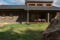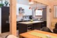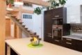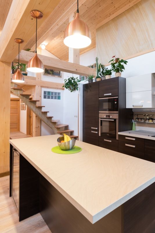 „Velký obývacího prostoru jsem koncipoval jako otevřený nejen kvůli osvětlení," pokračuje Oldřich, „ale i kvůli dodatečným tepelným ziskům. Stěna v kuchyni je obložena deskami z masivního pískovce. Slunce kámen prohřívá, bloky naakumulují teplo a následně vyhřívají prostor v nočních hodinách."