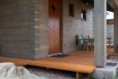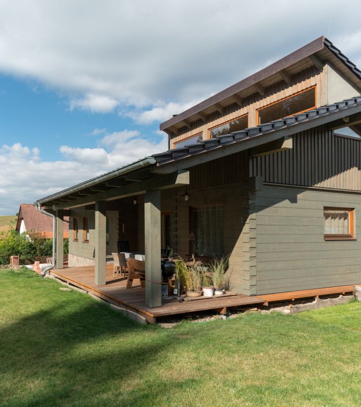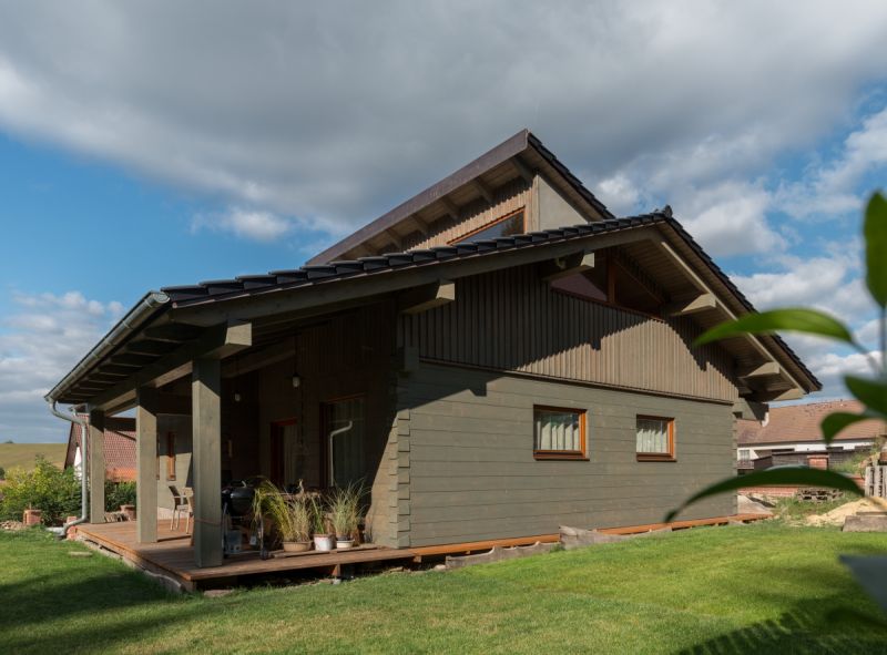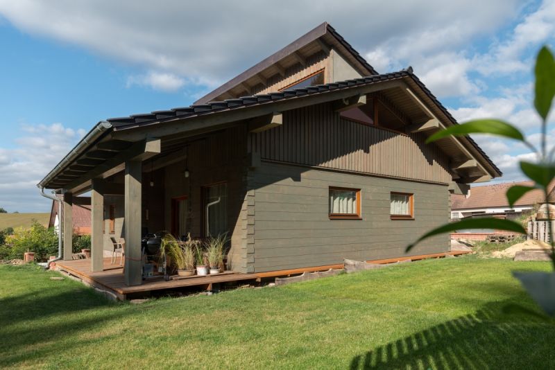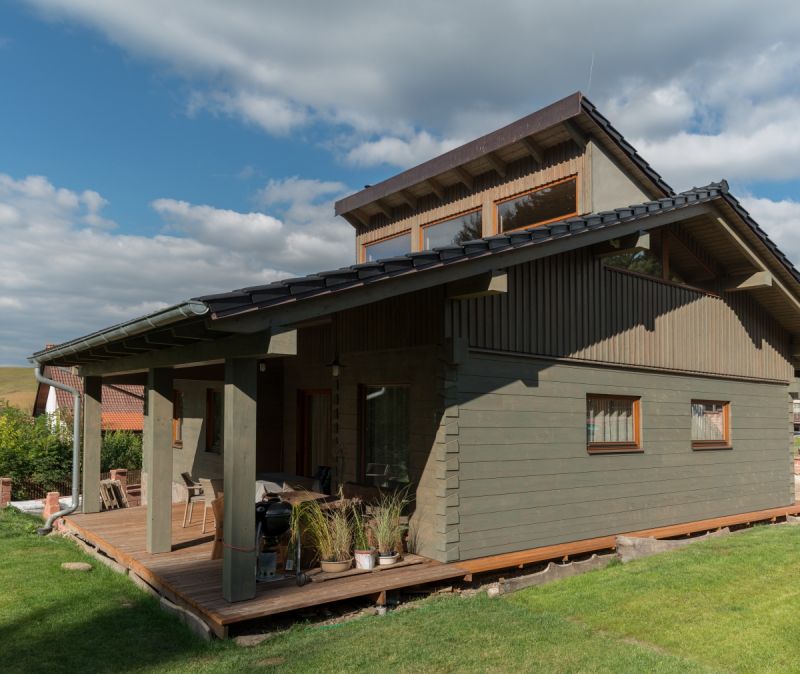 Zvenčí je dřevo ošetřeno lazurou z oleje s voskem. „Zvolil jsem zelenošedý odstín, protože dřevo časem černá. Barvu jsem nechtěl, protože pak je nutné povrch pravidelně udržovat, zatímco v tomto případě udělám ještě jeden barevně vyrovnávací nátěr spodní části domu, a bude hotovo. Pak už budu dům jen mýt, pokud bude třeba."