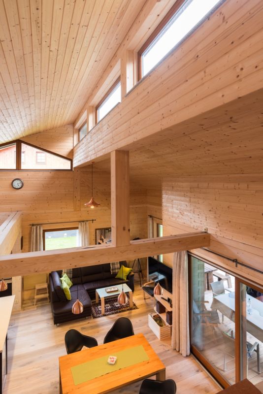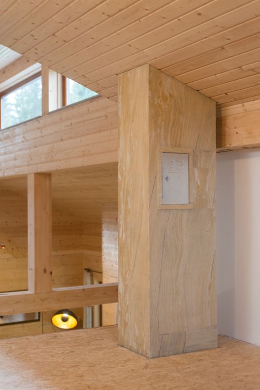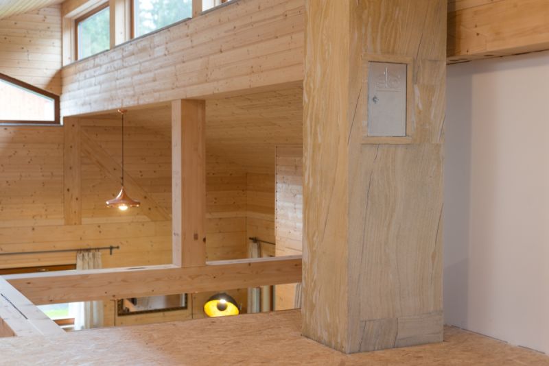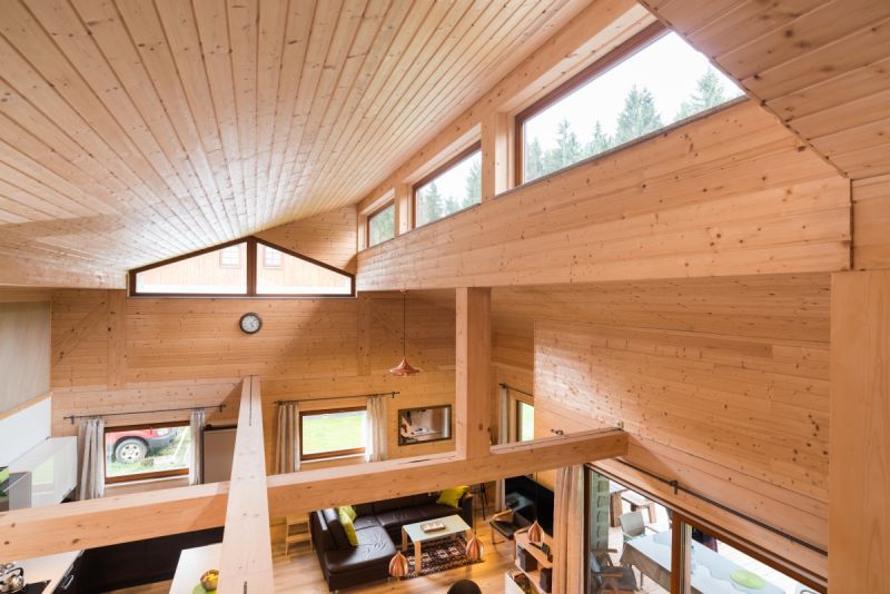 „Aby nebylo v domě příliš dřeva, a také kvůli akumulaci tepla, jsou zde zděné příčky z lehkých keramických příčkovek, případně z plných cihel. A to i přesto, že stavba je pak při dokončování mnohem pracnější. Navíc napojení dřeva a zděné části musí být kluzné, a musí být současně, pokud nejsou ponechány mezery na sedání, zajištěna také zvuková neprůzvučnost – mezery je třeba vyložit tepelnou izolací obalenou difuzní folií, aby se z ní neuvolňovala vlákna izolace. U realizace jsem chtěl být, aby bylo vše provedeno dobře. A výsledek je perfektní."
