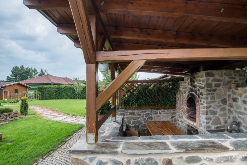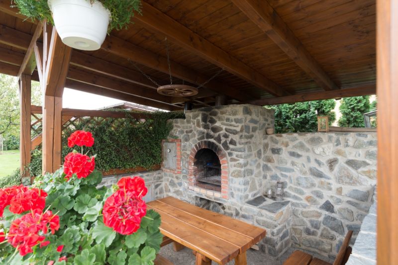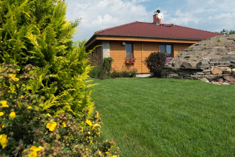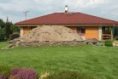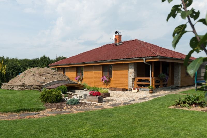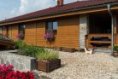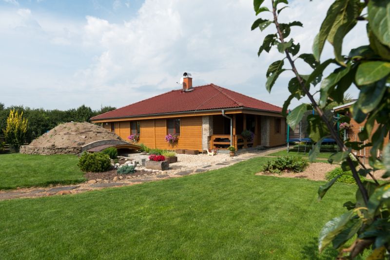 Dům je přízemní a na první pohled malý, plně však dostačuje rodině se třemi dětmi. Kromě obytného prostoru s kuchyní, jídelnou a obývacím pokojem je zde ještě dětský pokoj, společný pro všechny tři děti, ložnice, pracovna a hygienické zázemí. K obytnému prostoru lze počítat i terasu, na zahradě je také samostatné posezení a sklípek. „Sezení venku jsme využívali často," vysvětluje Eva, „ale pak jsme udělali venkovní ohniště, a protože děti na něm rády opékají špekáčky, sezení teď přichází ke slovu, třeba když chceme udit."