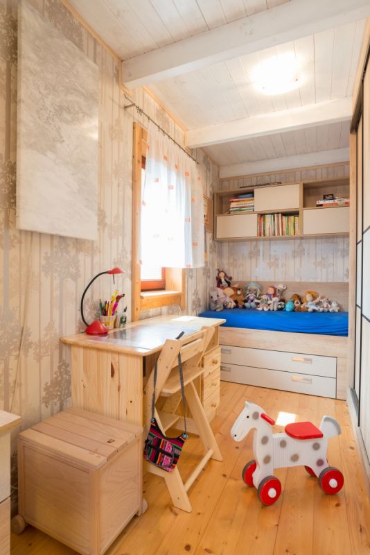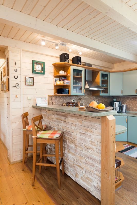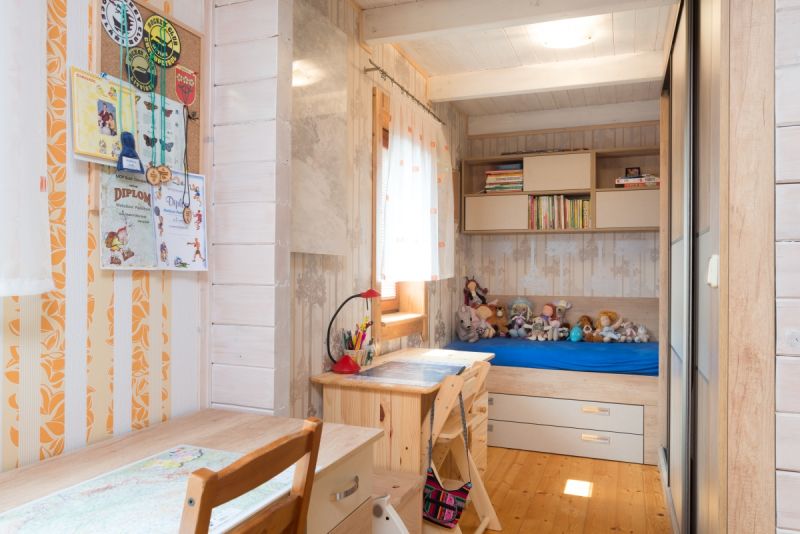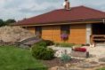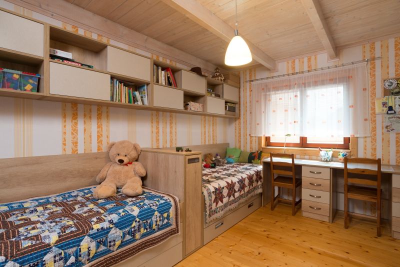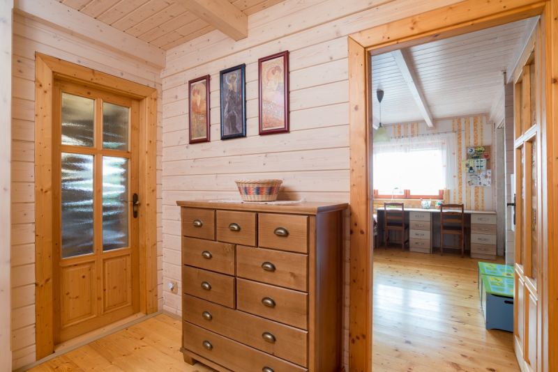 Že dům bude dřevostavba, bylo od počátku vlastně dané, ke dřevu mají v rodině blízký vztah. „Typově není dům ani srub ani roubenka," vysvětluje Martin, „roubenka má prapůvodně křížení na rybinový spoj, pro srub je typické přečnívající křížení trámů, tak, jak to máme my. Ale rohové kříže jsou ukryté pod kamenným obkladem, nechtěli jsme, aby byly vidět, protože v místní zástavbě nejsou obvyklé. Srubová stěna není masivní, ale je uvnitř zateplená. Dnes se stále častěji přistupuje k zateplení masivních dřevostaveb, takže se ve výsledku přesně typově nerozlišují. Základem jsou dvojité stěny a zateplují se tak, aby splňovaly energetické standardy, ale i ty mají své limity. Stavba klasických dřevěných staveb bude možná brzy minulostí...".