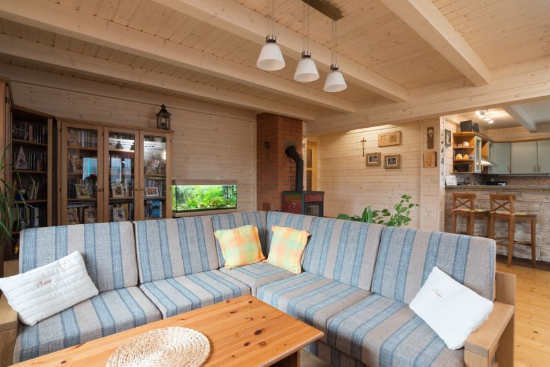 Uvnitř je dřevo ošetřené vodou ředitelným lakem v bílém odstínu, v části domu byl použit transparentní – tam dřevo ztmavlo, bílé se nezměnilo. Povrch je bezúdržbový. Část stěn je obložena imitací kamene.