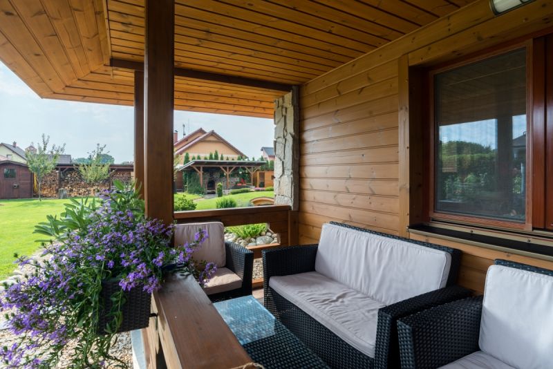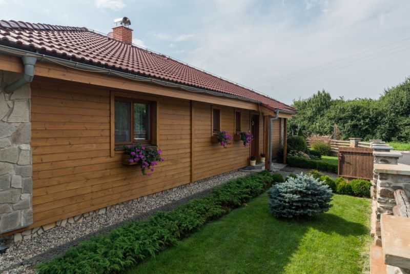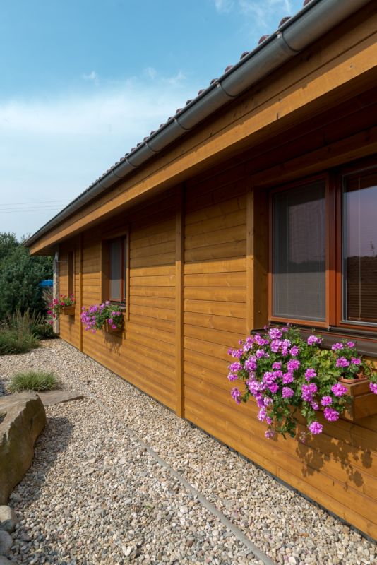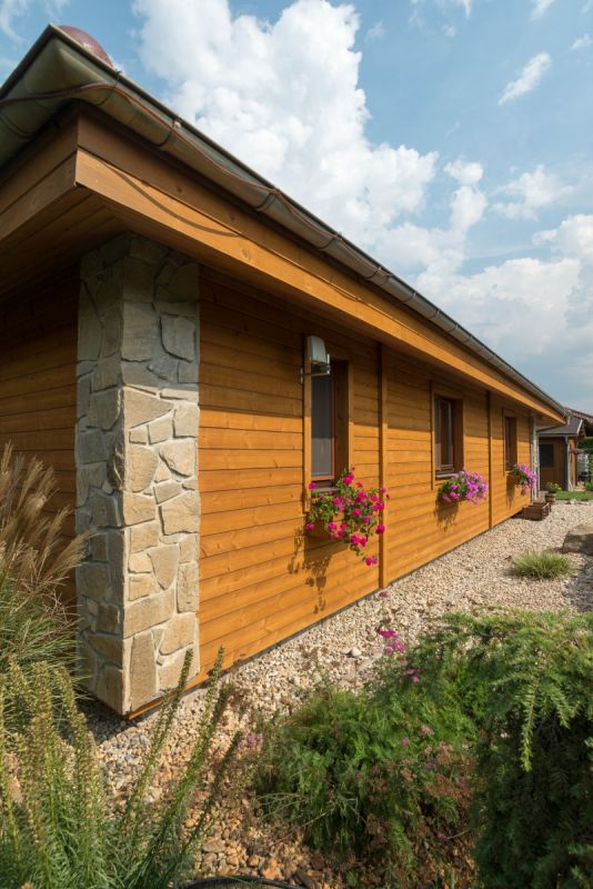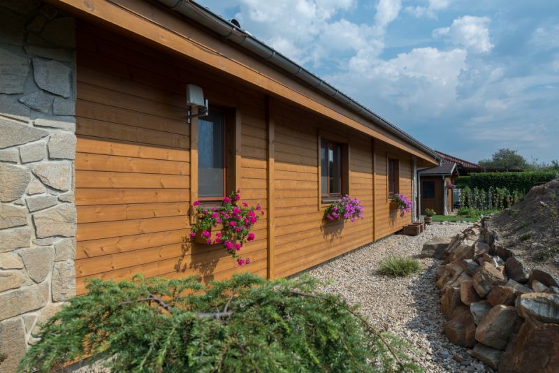 Dřevo je ošetřené tenkovrstvou lazurou, na osluněných stranách je třeba nátěr obnovovat zhruba každé čtyři roky, místa chráněná před sluníčkem a povětrnostními vlivy další péči nepotřebují. Bungalov umožňuje chránit fasádu z velké části konstrukčně – před sluncem a povětrnostními vlivy ochraňují především horní plochy stěn velké přesahy střechy.