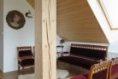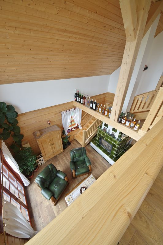 Petra se Zsoltem si původní projekt do jisté míry upravili. Vzdali se jedné místnosti a v patře si nechali zřídit galerii s velkými okny. Získali tak propojení prostoru v přízemí s podkrovím, galerie se navíc dá i tak využít k občasnému přespání návštěv. V budoucnu majitelé plánují, že bude na galerii pracovna. „Je tu nádherný výhled, kvůli němu jsme volili velká okna i polohu domu," říká Zsolt, ale Petra vnáší do romantiky trochu reality: „Tu krásu však trochu kazí, že se okna špatně myjí. Je to vlastně jediná věc, kterou bych vyřešila jinak. Na vnitřní stranu musíme při mytí oken přistavit třímetrový žebřík, měli jsme tam prostě nechat ochoz. A zvenku je to samozřejmě také problém, protože je to vysoko...".