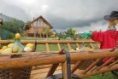 Pozemek je mírně svažitý, přední část roubenky je tedy ve výšce 1,3 metru. K domu proto z boku přiléhá ochoz a zepředu velká nezastřešená terasa, pod níž je otevřený prostor na uskladnění dřeva.