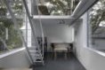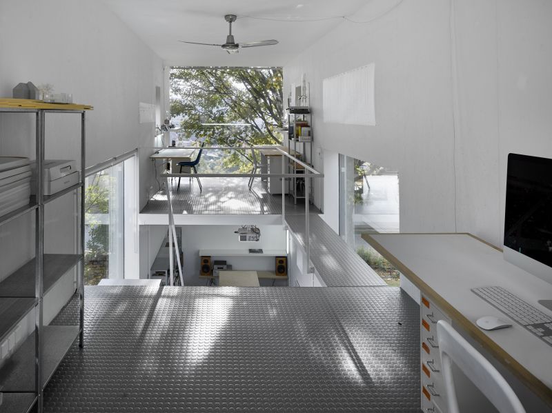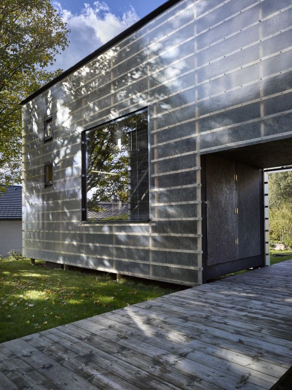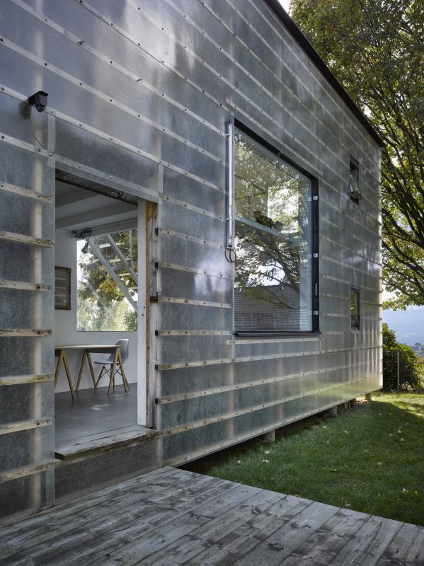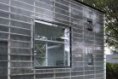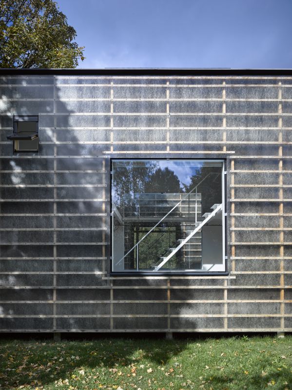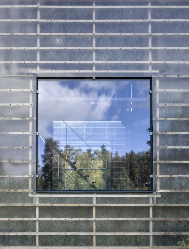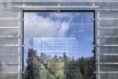 Materiály i provedení detailů je co nejúspornější. Velká okna jsou do konstrukce zasazena bez rámů, otevíravá jsou pouze malá. Velkoplošně zasklené plochy dodávají interiéru vzdušnost a prostornost. Průhledy ven do zahrady, ale také na vzdálené horizonty, najdeme v obou směrech. Prostor je bez jakýchkoli příček nebo stěn, aby zbytečně nenarůstaly stavební náklady a nepůsobil stísněně. Samozřejmě je možné dispozici flexibilně upravit a předělit, pokud by bylo potřeba.