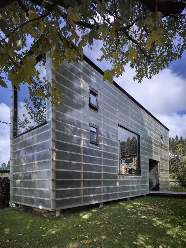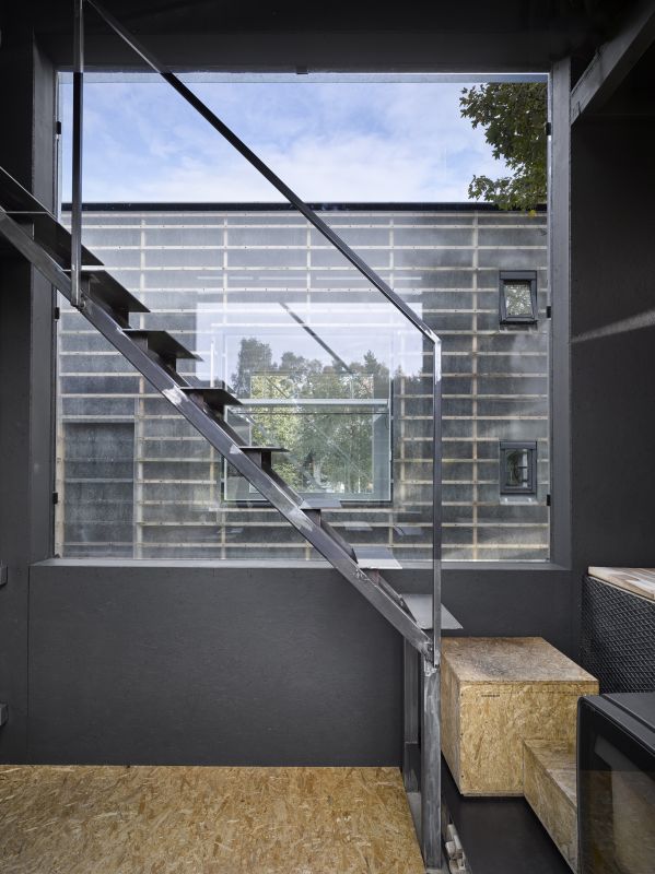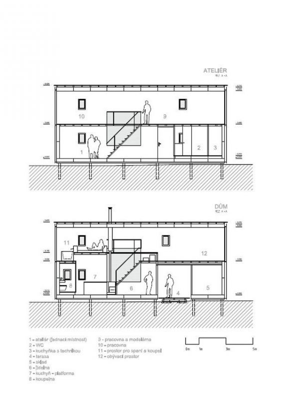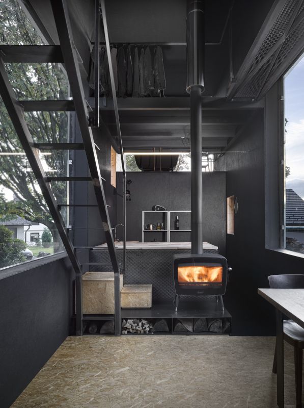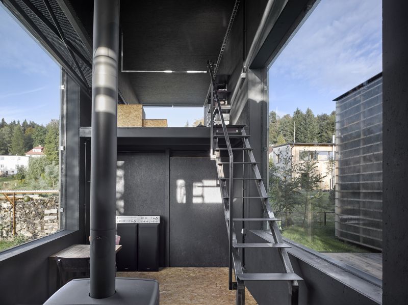 Na první pohled se z exteriéru obě stavby téměř neliší, rozdíl je ale ve funkci a barevném pojetí interiéru včetně odlišné dispozice. První z nich slouží jako ateliér a uvnitř je proveden v bílé. Topíme zde elektrickými keramickými přímotopy. Druhý objekt je určen pro bydlení, interiér je černý a topení zajišťují pouze kamna na dřevo. Černá barva navozuje sametový pocit, stejně tak teplo z ohně hraje zásadní roli. Je zde pocitově vždy o několik stupňů tepleji. V takovém prostoru se člověk přirozeně zklidní. Na podlaze je přírodní marmoleum, které je velmi příjemné pro relaxaci a chození na boso. Černá barva rámuje výhledy z oken a tvoří z nich živé obrazy. Je to úplný opak oproti vedlejšímu bílému ateliéru, který je neutrální, prosvětlenější a zve ke kreativní práci.
