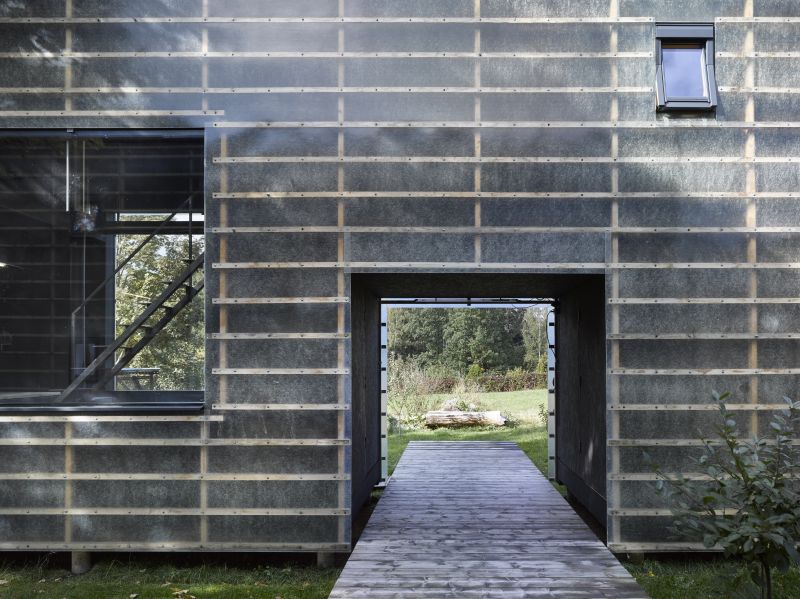 Objekty jsme navrhli z běžně používaných sendvičových panelů pro dřevostavby (polystyrenová izolace mezi dvěma OSB deskami) v rozměrech 3 × 1,25 a 5 × 1,25 metrů, ale bez zbytečného ořezu. Vnitřní světlá šířka prostoru po sestavení vychází přesně na 258 centimetrů. Nikdo nám nechtěl ze začátku uvěřit, že lze v takto úzkém prostoru fungovat. Museli jsme si proto sami vyzkoušet na vlastní kůži, jak se v něčem takovém žije. A výsledek po dvou letech? Bydlí se zde skvěle!
