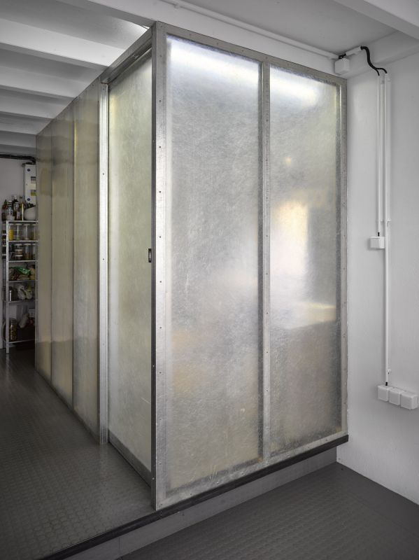 Rozvody všeho druhu jsou pohledově přiznané, vedené vně panelů, jelikož je obtížné vést vše uvnitř. Takto je to ale flexibilnější, levnější a jednodušší.