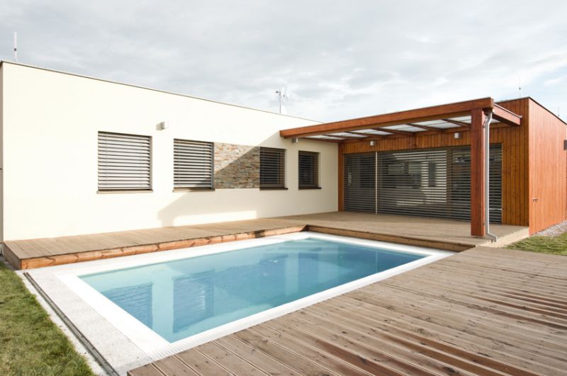 Zvenčí si pak rodina užívá mimo zahrady i atypicky řešenou terasu. Pomineme-li , že je opravdu velká, má dvojí funkci – její část se dá po kolejnicích odsunout a tím se odkryje zapuštěný bazén. Protože je v rodině malé dítě, jeví se toto řešení majitelům jako dobrý bezpečnostní prvek. Dalším prvkem ochrany domu je pak inteligentní motorický zámek, umožňující bezkontaktní obsluhu dveří z obou stran jen na základě otisku prstu, ale i ovládání dveří z chytrého telefonu nebo tabletu.