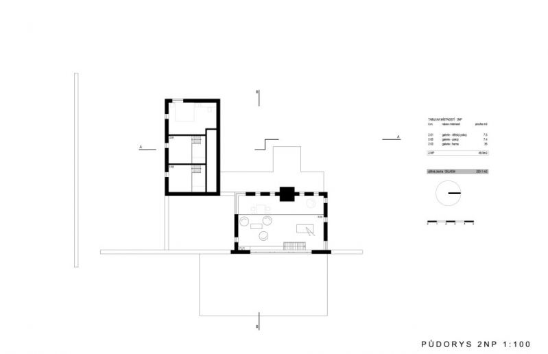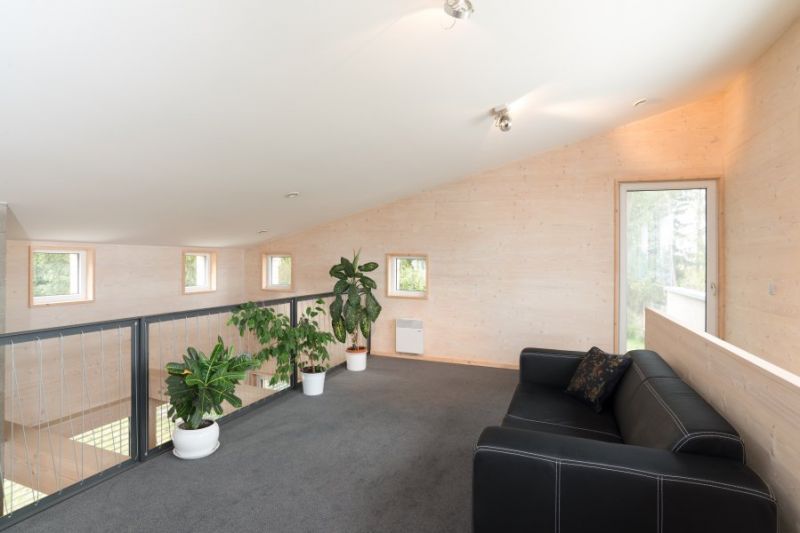 Stavba je funkčně rozdělena do noční části s ložnicemi orientované na jih do klidného borového lesa a denní části s otevřeným obývacím pokojem a galerií. Záměrem bylo vytvořit raději jeden univerzální prostor pro různé funkce, než mít několik pro každou funkci zvlášť. Galerie se tedy dá využít pro cvičení, jako herna, případně tam lze vybudovat dva plnohodnotné pokoje s koupelnou. Rozvody jsou připraveny.