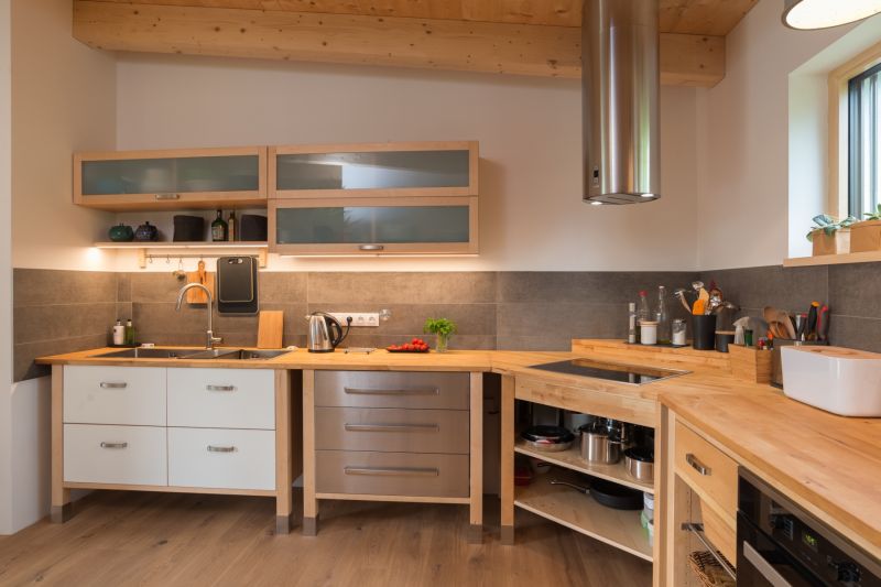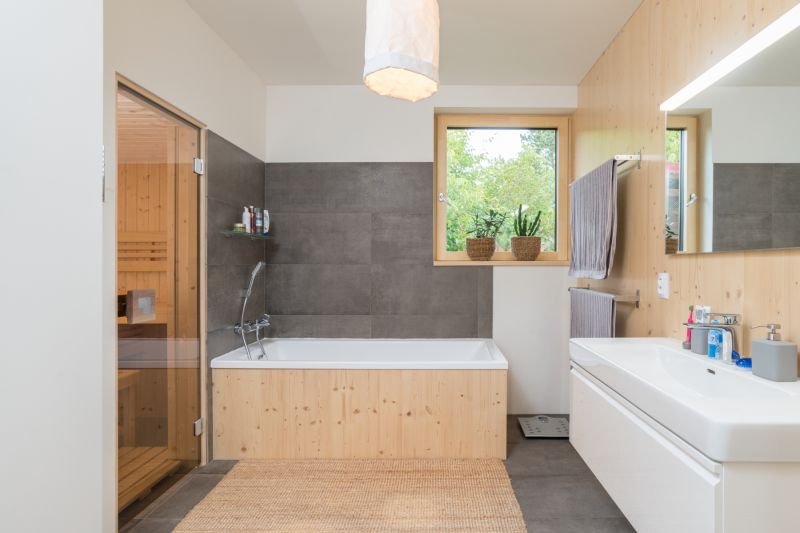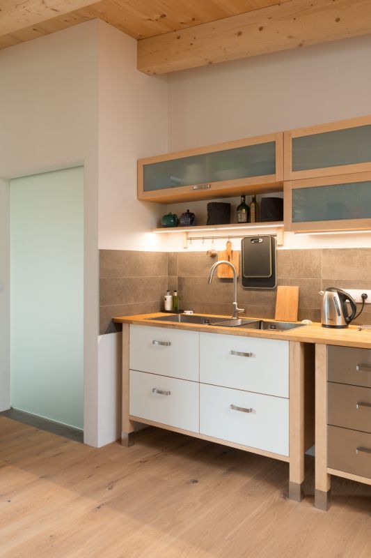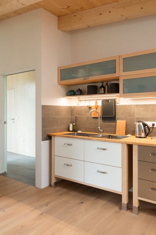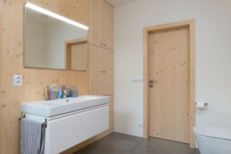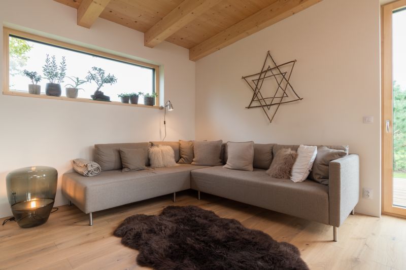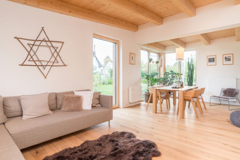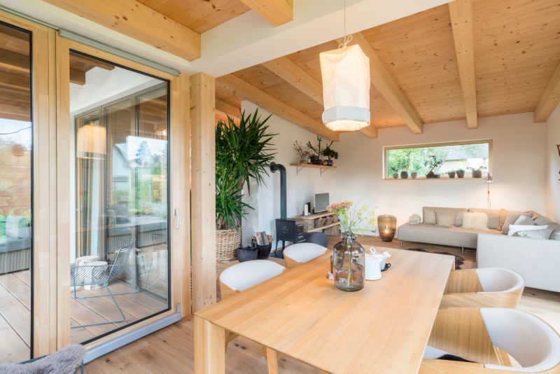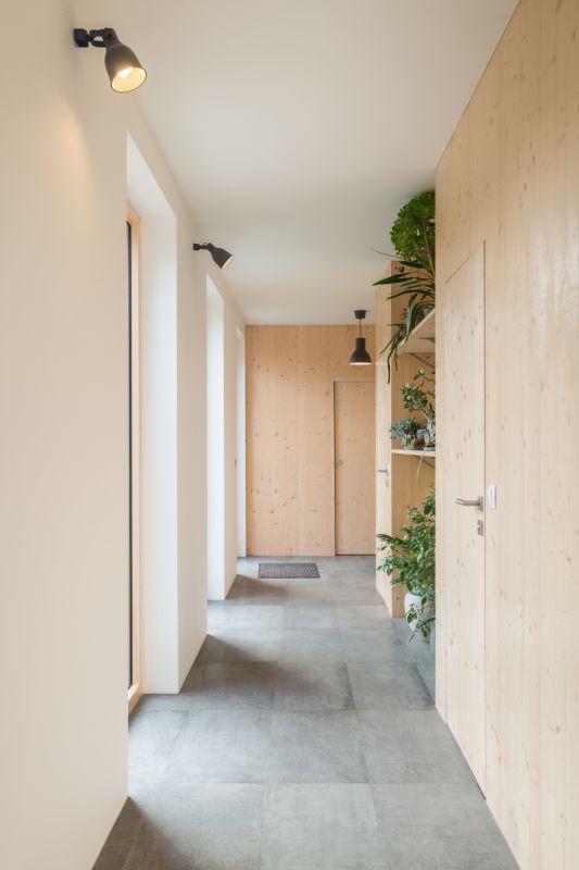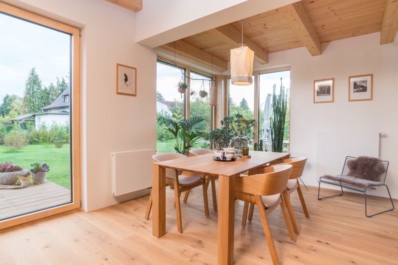 Konstrukční systém: masivní dřevěné panely (CLT), pohledové i skryté krokve, dřevovláknitá tepelná izolace
