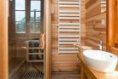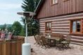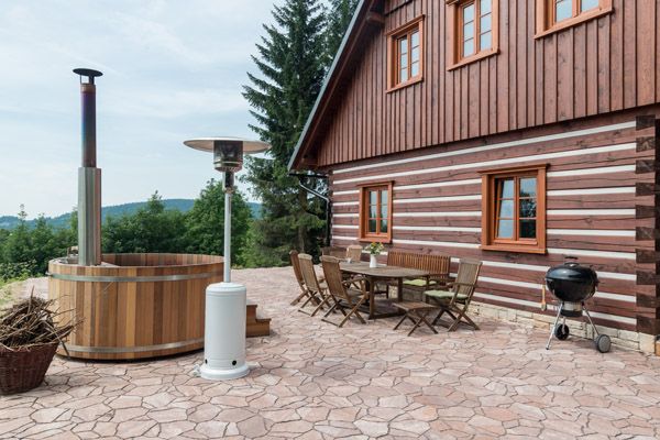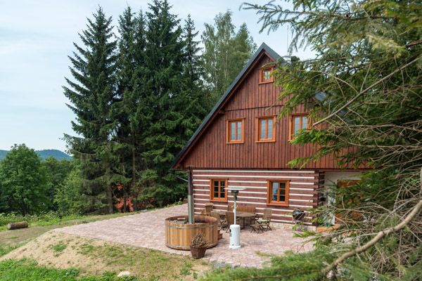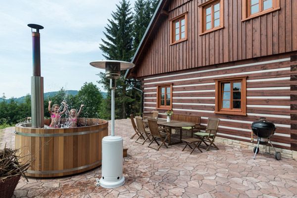 V přízemí je také koupelna se saunou, odkud lze vyjít ven z domu a při saunování se ochladit. Ovšem nejlepší relaxace čeká venku – koupací sud, který v zimě i v létě užívají nejen majitelé, ale i návštěvníci. No považte – zima,sníh a mráz a na terase koupací sud s vyhřívanou vodou, nabízející koupání s výhledem do kraje.