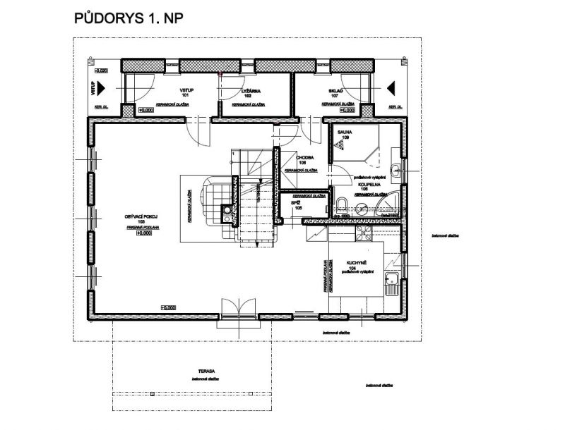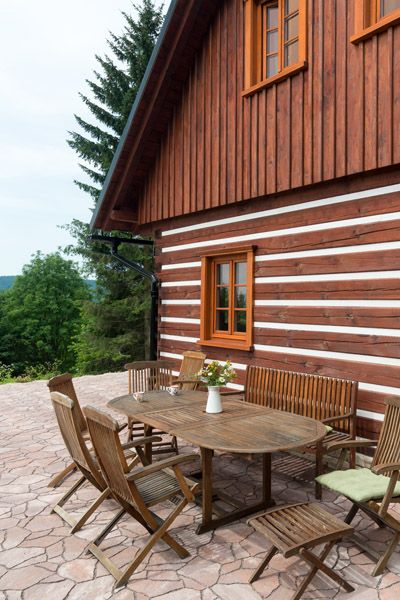Ošetření stěn: interiér bez ošetření, podhledy lazurované bílé palubky, exteriér – olejová lazura a štuková fasáda