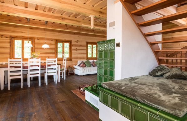 Teplo: kachlová kamna, alternativní zdroj – přímotopné podlahové topení Celková tloušťka stěny: 20 cm