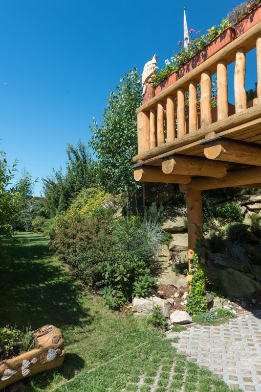 Tenhle dům byl hned zpočátku samé překvapení. Pár kroků od silnice se v moderní zástavbě náhle ukázalo roubené průčelí, ale stačilo se trochu pootočit a ocitli jsme se na zahradě a ve zcela jiném světě, plném indiánských symbolů a dřevěných (nejen indiánských) plastik.