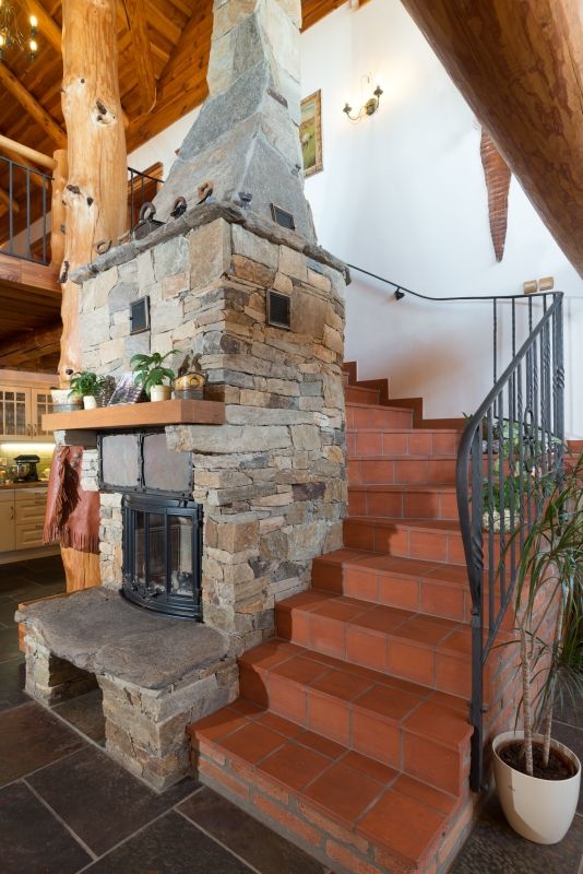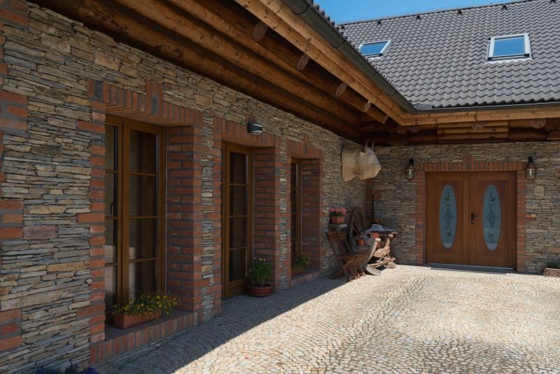 V roce 2005 tedy začali hledat firmu, která by takový dům postavila. „Jednou z možností bylo nechat si srub zhotovit v USA a zde sestavit," vysvětluje Josef. „Ovšem to by bylo finančně i organizačně velmi náročné, naštěstí jsme v té době našli stavitele, který se právě vrátil po dvou letech ze Spojených států, kde pracoval ve firmě, zabývající se stavbou srubů. Problém byl v tom, že jsme chtěli stavět opravdu velký dům, který však on nemohl v tehdejší době za daných podmínek vzhledem k rozsahu prací v reálném čase postavit. Zvolili jsme tedy kombinaci zděné a srubové stavby a zpětně si myslím, že to bylo naše nejlepší rozhodnutí. Protože pokud srub v interiéru neoživíte bílými plochami, je tmavý, jednolitý a někomu může vadit i „příliš" dřeva. Abychom též zděné části domu dodali ráz country stavby, vnější plášť jsme zateplili a obložili jej kamenem a starými cihlami. Kombinace zděné a dřevěné konstrukce je výhodná rovněž z technického hlediska – v průběhu stavby jsme nemuseli řešit problémy například s vedením sítí a podobně. Ve dřevě je to přece jen složitější, a pokud nejsou rozvody přesně naplánované, těžko se dodělávají."