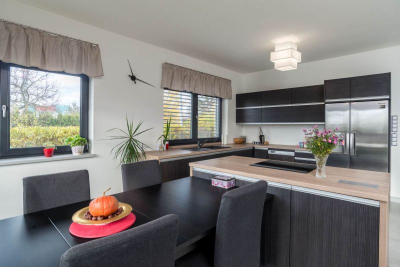 Dřevostavbu jsme původně ani nechtěli, zvažovali jsme zděný dům. Báli jsme se akustiky dvoupatrového objektu. Hledali jsme však dodavatele a narazili na firmu, která nám velmi padla do oka. Kromě konstrukce dřevostaveb, kterou realizuje a která nám příliš neimponovala, přišla v úvahu kombinovaná konstrukce – betonový prefabrikovaný skelet a sendvičové stěny panelové dřevostavby. Ta nás nadchla. Nejenže doba realizace je krátká a velká hmotnost perfektně řeší obávaný přenos hluku (součástí jsou železobetonové stropy), ale betonový skelet umožňuje daleko svobodnější dispozici. Díky němu jsme mohli upustit od nosné stěny napříč obývacím prostorem a dovolit si mnohem víc, bez limitů z hlediska rozponů nebo nosných prvků někde uprostřed místností. Ještě teď nám vrtá hlavou řešení, kdy bychom zrušili dolní ložnici v přízemí a obytný prostor ještě víc otevřeli. Zřejmě hudba budoucnosti.