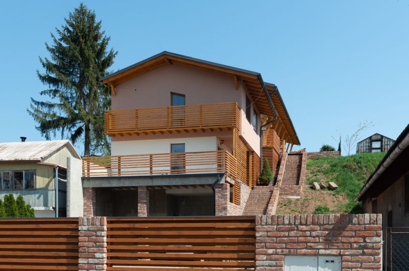 Tvar domu se musel podřídit hned dvěma specifickým vlastnostem pozemku. Jednak délce devadesát metrů k poměrně malé čtrnáctimetrové šířce, a pak svažitosti pozemku. Na čtyřech metrech délky je skoro sedm metrů převýšení. Všechny okolní stavby jsou umístěny u přístupové komunikace, tedy ve spodní části pozemků, a kvůli veliké svažitosti užívají horní části jen jako zahrádky nebo vůbec. Naším přáním bylo navržení takové dispozice, která by vybízela k plnohodnotnému užívání celé plochy parcely. Logicky z toho vyplynulo uspořádání stavby, kde spodní část přilehlá ke komunikaci slouží k parkování vozidel, ve svahu je situována hlavní obytná zóna a horní, plochá část je využívána jako odpočinkový prostor zahrady. Při této dispozici je velkým bonusem krásný výhled do kraje vysoko nad ostatními střechami.
