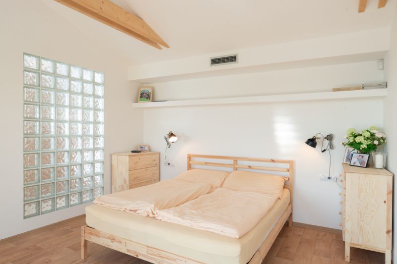 Ne, ta jsou jen obyčejná, na efekt. Topení a větrání zajišťuje aktivní rekuperační jednotka s čerpadlem vzduch-vzduch a přičleněnou klimatizací. Vše hlídají automatická teplotní čidla v jednotlivých místnostech s možností separátní regulace na požadovanou úroveň a možností dálkového ovládání přes aplikaci. Ohřev vody zajišťuje energie z fotovoltaických panelů, jen v případě špatného počasí je voda dohřívána elektrickou patronou v nádrži. Je příjemné nemuset se starat o to, jestli máme zatopit, nebo vyvětrat, a v domě je konstantní teplota.