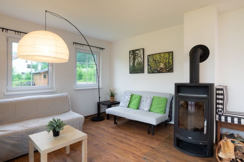 Jaké by to bylo bydlení v horách bez skutečného ohně v kamnech. Když ovšem nezažehnou, neznamená to, že bude zima. O teplo se stará ještě teplovodní podlahové topení, které lze zapnout i na dálku. Když tedy majitelé vědí, že dorazí, a chtějí přijít do vyhřátého domova, stačí si topení zapnout zhruba čtyři hodiny předem. Energetická nenáročnost je v souladu s ideou rozumného bydlení bez horentních nákladů na provoz. Ztráty jsou zhruba pět kilowatt, takže postačuje elektrický kotel o výkonu šest kilowatt.