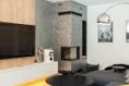 L.: Díky velkým oknům a orientaci domu na jihovýchod je v obývacím pokoji hodně světla. Šedou jsem proto kombinovala s bílou a s prvky dřeva, které vše zateplí a vyváží. Ovšem bez krbu by to nešlo.