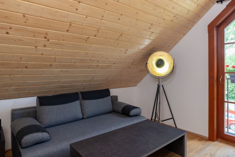 Zpočátku koketovali se srubem, nakonec myšlenku na dům ze syrové kulatiny opustili a dali přednost roubené konstrukci z lepených hranolů. Klasická stavba obdélníkového půdorysu a jednoduchého tvaru působí zvenku kompaktně. „Chtěli jsme štítovou stěnu s francouzskými okny a obývací pokoj oddělený od kuchyně," vysvětluje Honza, „poslouchám hodně hudbu, možnost obě místnosti uzavřít je tedy praktická. Rozhodli jsme se pro posuvné dveře, ale ty se do roubené stěny umisťují obtížně, příčka mezi obývacím pokojem a kuchyní musela být proto zděná, aby se do ní dalo instalovat dveřní pouzdro. Dům projektoval nezávislý projektant, v těchto i dalších našich požadavcích jsme s ním jen obtížně hledali společnou řeč, projekt proto upravila realizační firma. V tomto případě byl problém i v tom, že stavební dokumentace nebyla zcela v pořádku z hlediska statiky a muselo dojít ke změně dispozic a štítové stěny domu. Vše bylo o to složitější, že jsme již měli zhotovenou základovou desku podle původní dokumentace."