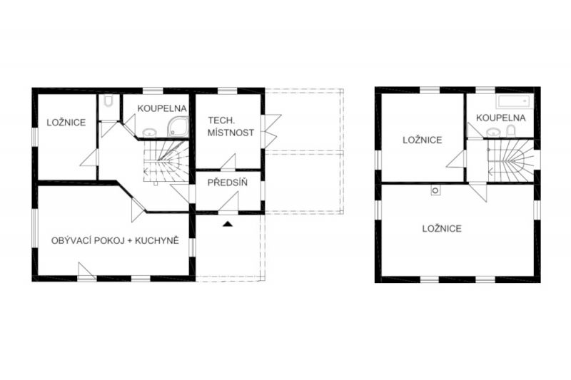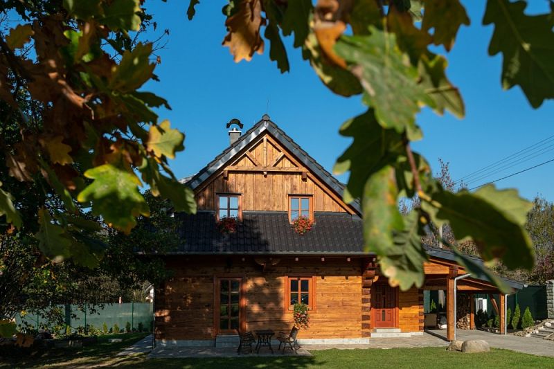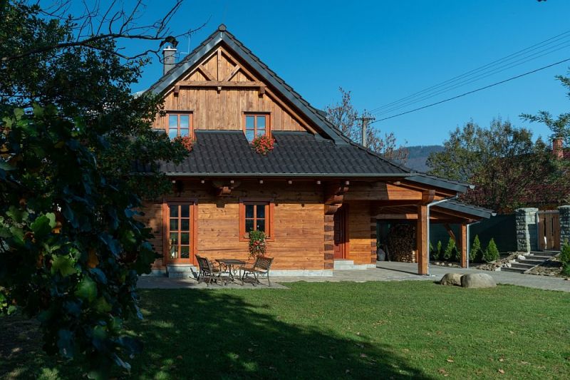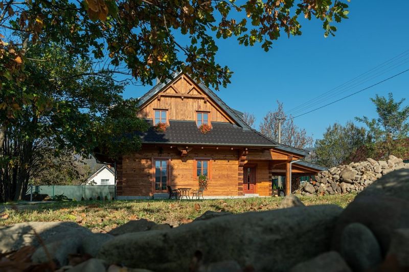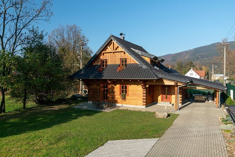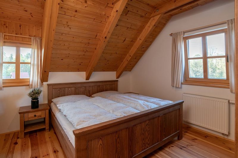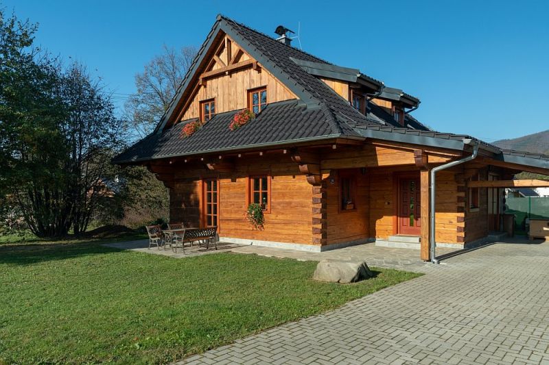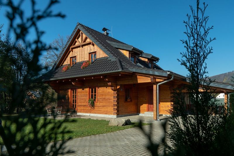 Konstrukční systém: jedlové dřevo, masivní roubené trámy 300/300 mm, vnitřní příčky – 1. NP zděné, podkroví Ekopanely