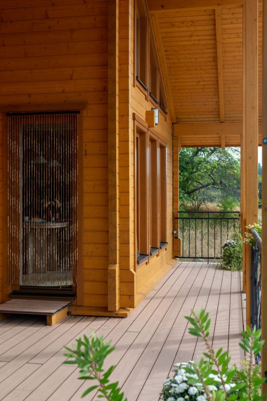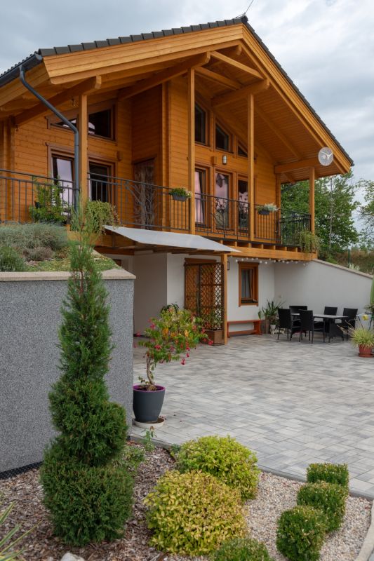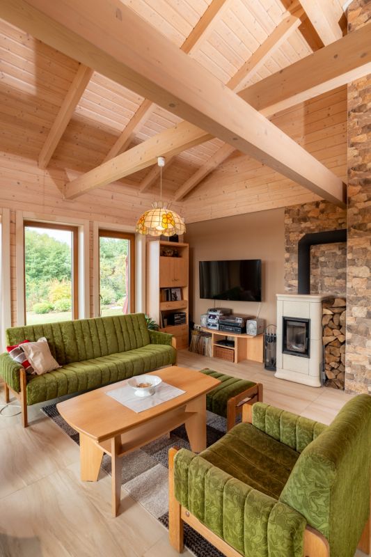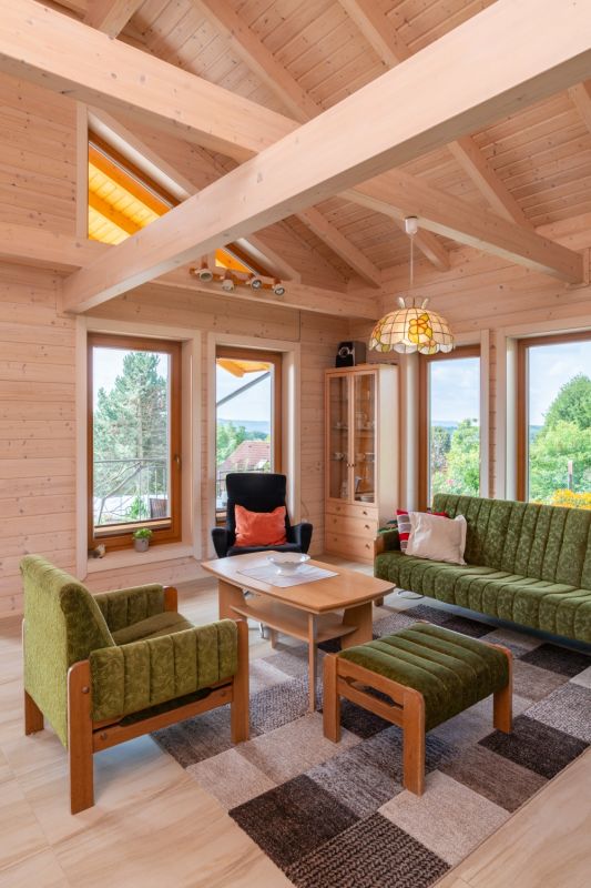 Konstrukční systém: srubová konstrukce z lepených sušených hranolů s dřevěnou izolací a obkladem