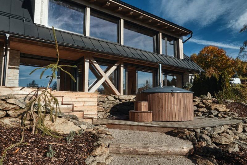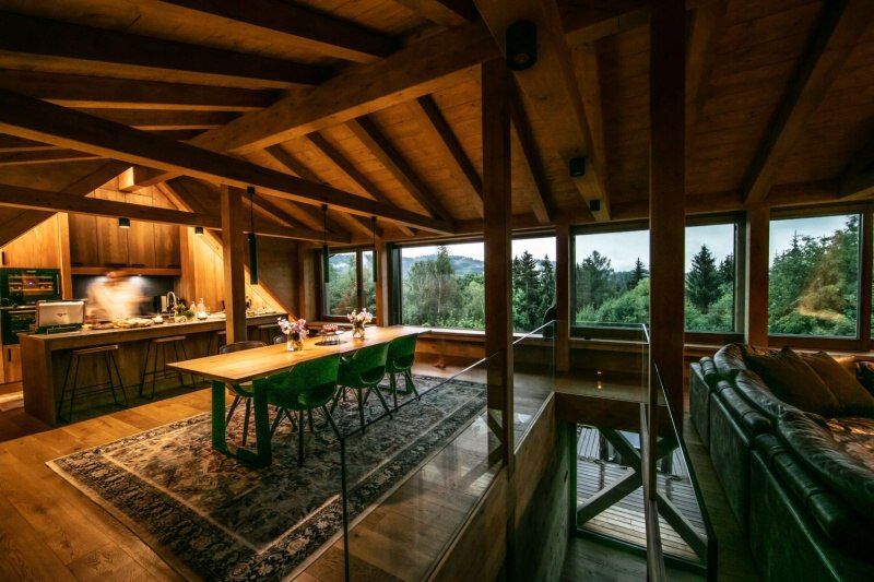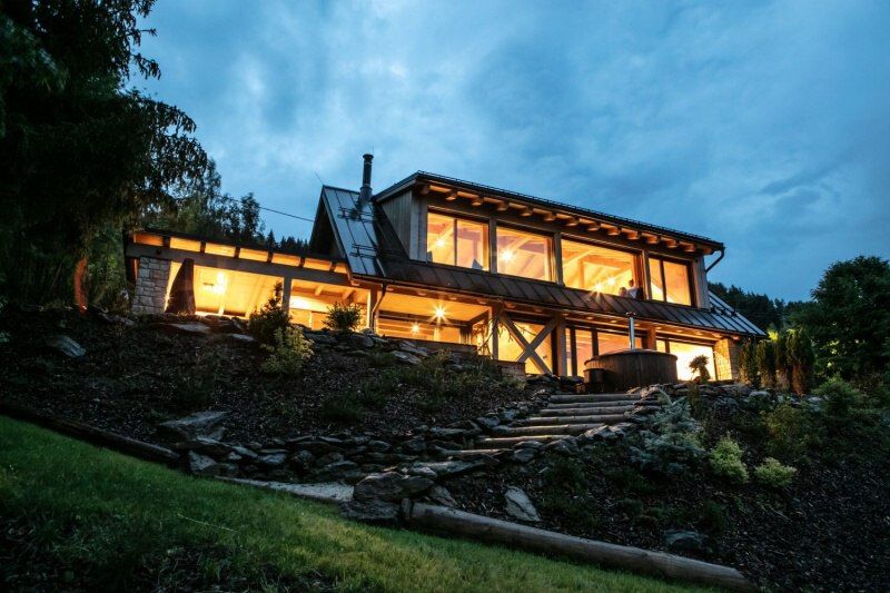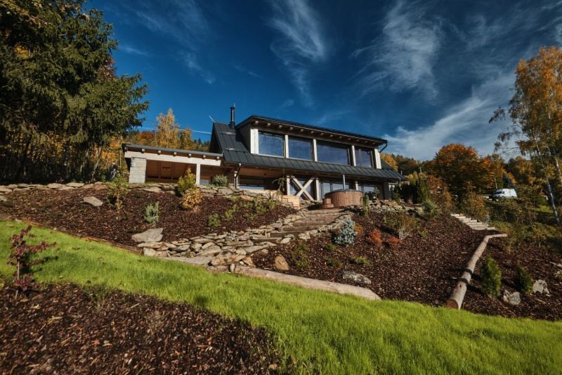 Tak osamělý, jak je to jen možné, a tak společenský, jak je to nutné. Právě tyto dva atributy na mě zapůsobily při pohledu na dům v Jizerských horách. Na první pohled patrné prvky těžkého dřevěného skeletu napovídaly, že uvnitř zažiji onen vítaný pocit, kdy jste v zámotku s horkým nápojem v ruce zachumláni pod dekou před ohněm krbu. A že ani nemusí být venku sibérie tento „chalet" beze zbytku potvrdil.