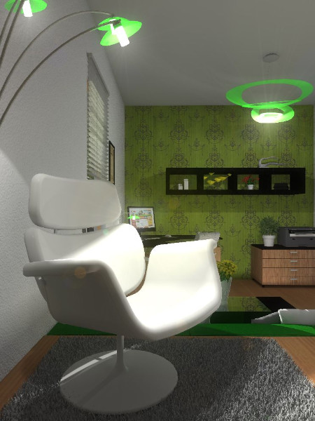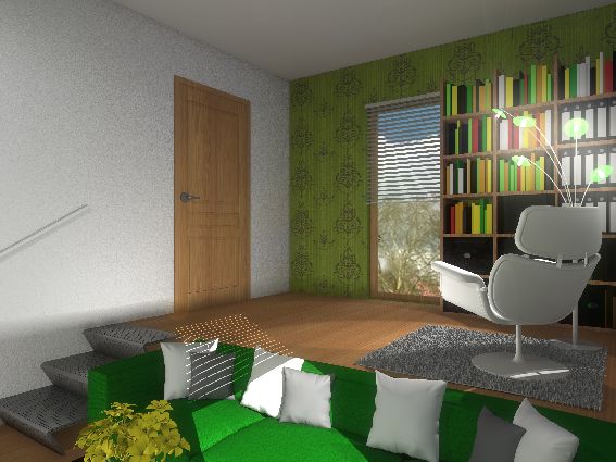 Barevné tóny jsou sladěny do odstínů zelené, dlouhou místnost opticky zkracuje výrazná ornamentální vliesová tapeta, použitá na kratších stěnách. Jednoduché schodiště z perforovaného plechu nezatěžuje interiér a pomáhá bezpečně a pohodlně překonat půlmetrový výškový rozdíl. V interiéru jsou použita celkem tři svítidla – stojací lampa u knihovny, jednoduchá lampička na pracovním stole a designový lustr se Zdravým světlem, které zdařile imituje světlo denní a vytváří tak příhodné podmínky pro práci.
