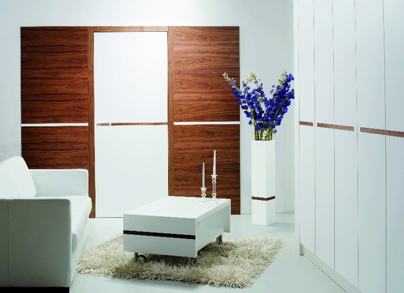 „Povrch dveří může být dýhovaný, ve vysokém lesku, laminátu, kovu nebo různě barevný. Zákazník si vybere jak povrchovou úpravu kování, tak hlavně materiál pro dekorativní vkládání do kliky, který pak tvoří hlavní spojující osu," doplňuje Ing. Vítek. Spojující linka vždy navazuje na dveřní kování. U otočných dveří je na ploše dveřního křídla v horizontální rovině a u dveří posuvných, u kterých je jako kování svisle umístěná mušle, prochází designový proužek ve svislé rovině.