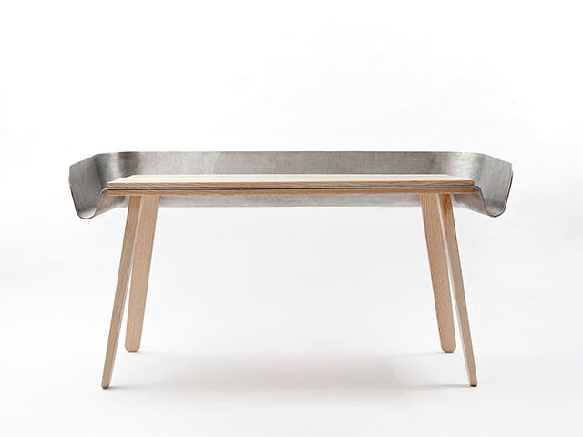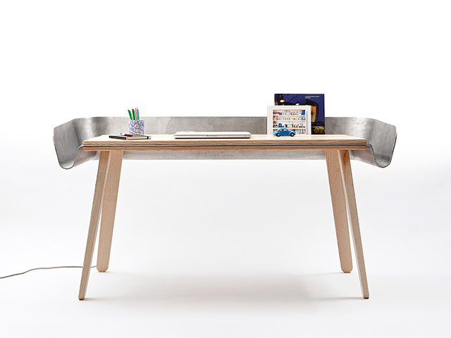 Mezi dřevěnou desku stolu je integrován hliníkový plát, který přesahuje rozměry pracovní plochy a na okrajích je ohnut do tvaru speciálního „límce", který má svému uživateli pomoci ve dvou směrech. V první řadě funguje jako odkládací plocha, do které je možné umístit třeba rozečtenou knihu nalistovanou na požadované straně, jeho druhou předností je zachycování padajících předmětů z desky stolu. Nikdy už tak pod stolem nebudete muset pátrat po zakutálené tužce.