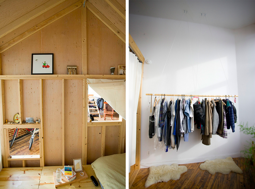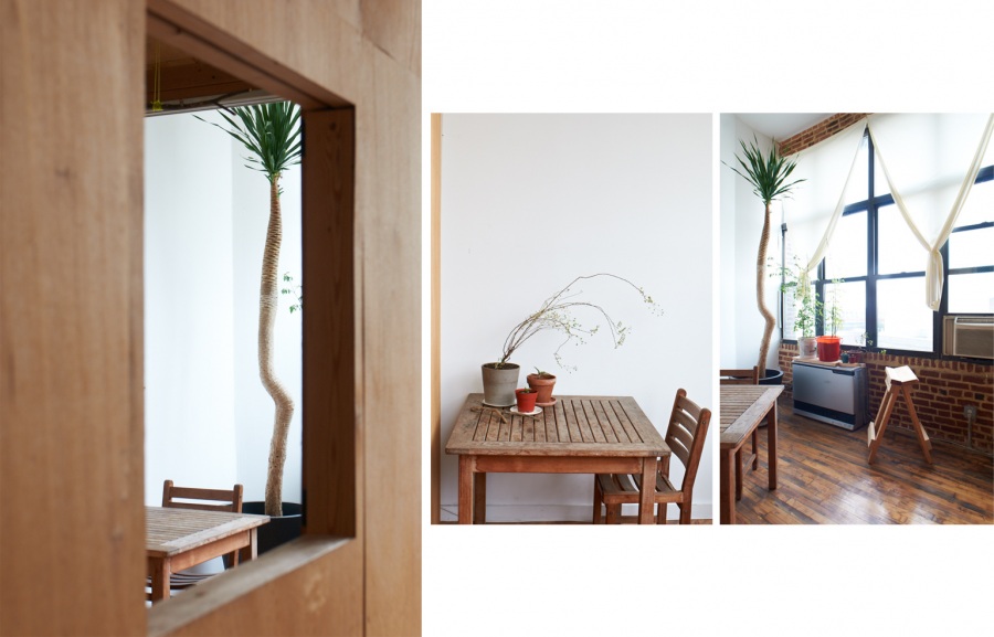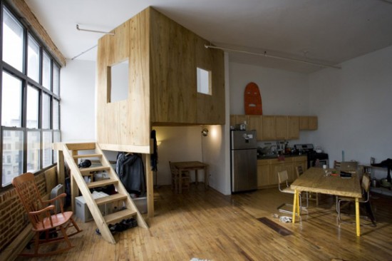 Stavby ze dřeva si najdou své místo i v interiéru bývalé textilní továrny. Důkazem je projekt architektonického ateliéru Bow-Wow v New Yorku. Japonský architekt Terri Chiao se s velkým vzdušným prostorem loftového bytu vypořádal velmi neotřelým způsobem. Do loftu vestavěl dva dřevěné objekty – dům se šikmou střechou a čajový altán.