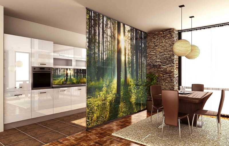 Např. do Grafoskla je možné zalaminovat jakýkoliv materiál od vytisknuté fotografie, přes látku, plátky dýhy nebo sušených rostlin. Můžeme jej použít jako obklad za kuchyňskou linku, na skleněné stěny, celoskleněné dveře apod. Použitím vhodného dekoru či přímo fotografie tak můžeme pozvednout přírodní charakter interiéru.