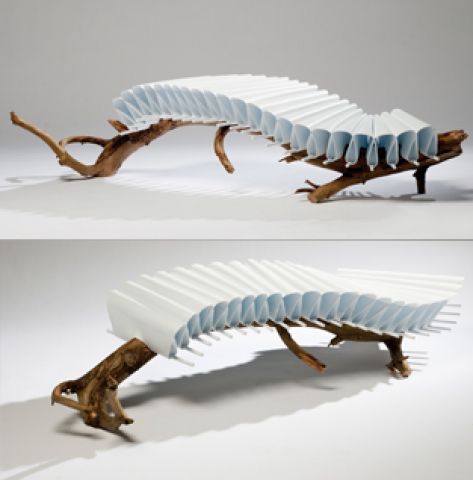 No. 3 bench – pohovka č. 3 je poslední z řady zajímavých a neotřelých nápadů. Vlny pevného polypropylenu jsou k dřevěné větvi připevněné pomocí kovových trnů. Polypropylenový sedák kopíruje tvar nepravidelné, prohnuté větve. Fascinující kombinace dvou zcela odlišných materiálů působí nesourodým a přesto spojitým dojmem. Z obrázků těžko odhadnout, jak by se na pohovce odpočívalo, jako zajímavý umělecký předmět však poslouží zcela určitě.