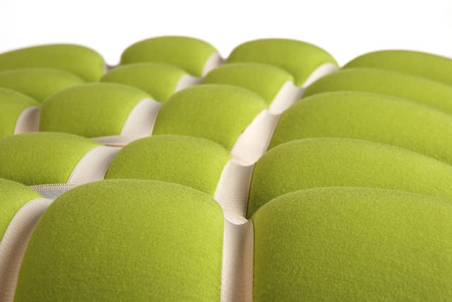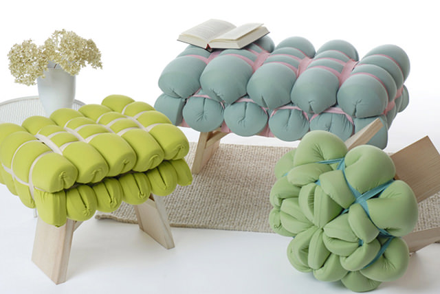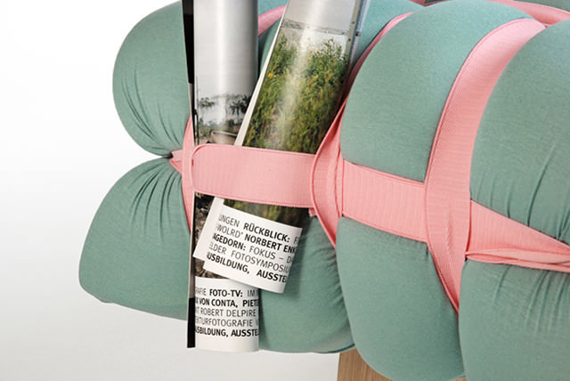 Meike Harde tak udělala z přirozené vlastnosti drapérie, tedy z jejího vlnění a vrásnění hlavní motiv své kolekce nábytku. Přehodnotila běžné čalounické techniky a ke svému výtvoru se postavila skutečně kreativně. Klasickou molitanovou podložku, tvořenou dlouhým obdélníkem, ukryla do různobarevných potahů a pak pomocí vrstvení, mačkání a tlustých gum vytvořila originální tvary.