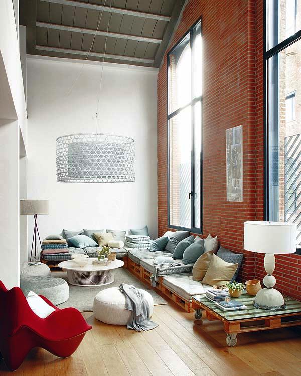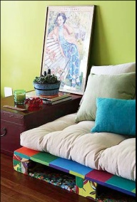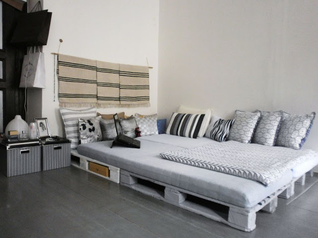 Při užití palet v interiéru je potřeba věnovat větší pozornost jejich povrchové úpravě. Důkladné očištění je samozřejmostí, můžeme je také přebrousit a opatřit dřevo nátěrem podle našich představ, nebo je nechat prostě tak, jak jsou.