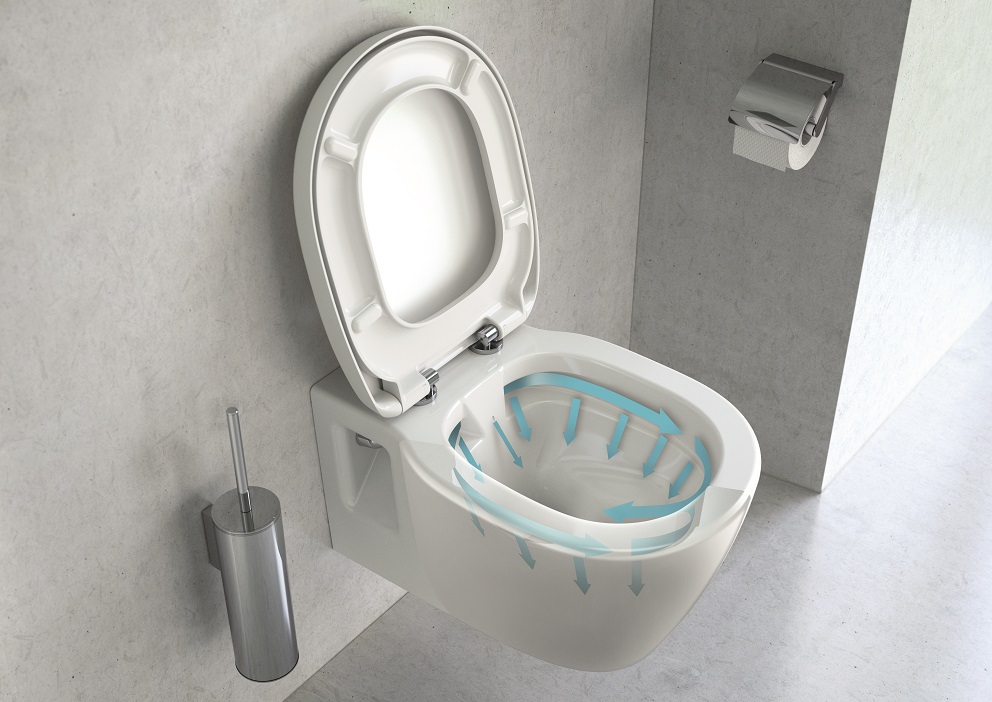 Klozet Connect Rimless WC je v zadní části opatřen třemi splachovacími otvory. Hlavní proud vody proudí z bočních otvorů přes otevřený splachovací kruh a stéká po celém povrchu klozetu směrem dolů. Voda protékající třetím malým otvorem uprostřed usnadňuje spláchnutí toaletního papíru. Výsledkem je stoprocentní oplach celého povrchu mísy – a tím i vysoká úroveň hygieny. Inovativní technika splachování navíc zaručuje stoprocentní oplach mísy, aniž by voda měla tendenci „vyšplouchnout" ven.