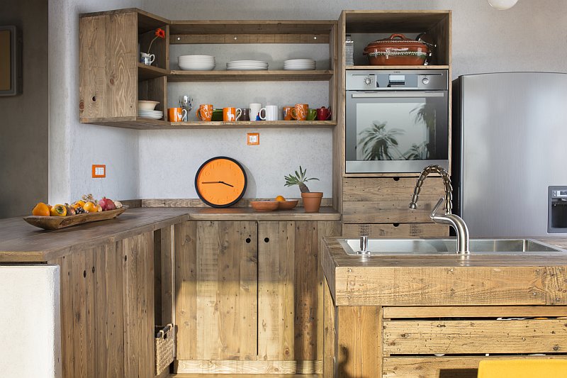 Jednotlivá prkna se zaříznou na míru a vyrobí se z nich panely pro dvířka a čela zásuvek – každé je v podstatě originál, záleží na konkrétním rozměru a typu otevírání. Dveře myčky tvoří jednotlivá prkna pouze lepená jako spárovka, u ostatních dvířek jsou jednolitá prkna kromě lepení spojena i na pero-drážku. Kuchyně nemá úchytky – otevírání dvířek umožňuje kulatý otvor na prst.