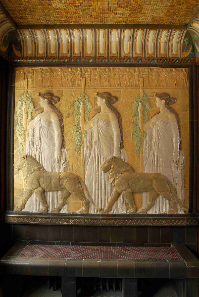 Celá výzdoba tvořená mimo jiné z mozaiky na stropě a z reliéfních ornamentů na sloupech navozuje atmosféru Egypta a Orientu, která dýchá i z rozměrných reliéfů umístěných ve vstupním vestibulu, jejichž hlavním motivem jsou figury lvů inspirované uměním Egypta a oblasti Středního a Blízkého východu.