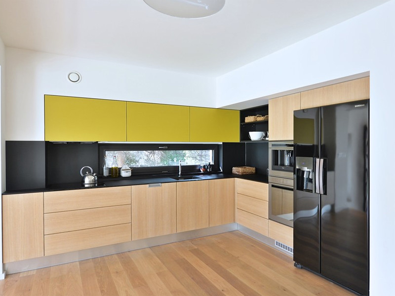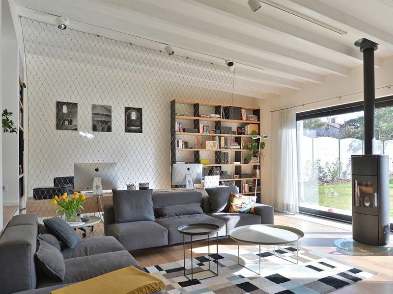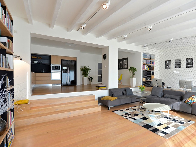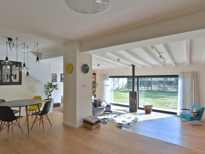 Nejdůležitějším úkolem bylo zařídit prostor o velikosti 60 m2, do kterého se musela vejít kuchyň, jídelní kout, obývací pokoj a zároveň i pracovna rodičů. Dvě třetiny tohoto prostoru s šestimetrovým antracitovým oknem na jih a krbovými kamny jsou na úrovni terénu, tj. o 80 cm níže než zbývající část 1. nadzemního podlaží. Rozdíl je vyrovnán třemi schody, které zároveň slouží k sezení, když se sejde více přátel. V druhé části místnosti je potom kuchyňská linka a jídelní kout, kterému vévodí kompozice světel Shadow společně s ikonickými židlemi Eames.
