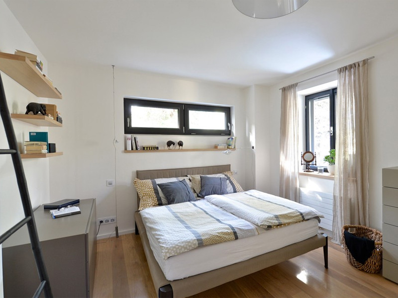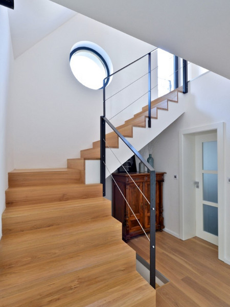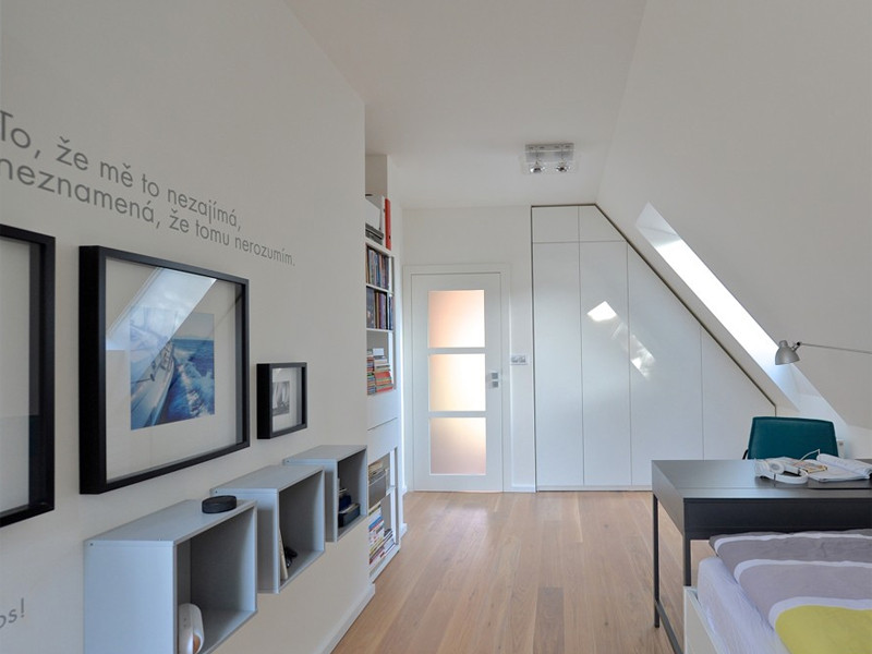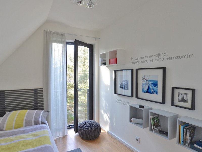 Schodiště do 2. nadzemního podlaží je osvětleno kulatým oknem – „podpisem" architektonického studia, kterému se do horního patra podařilo umístit koupelnu dětí a jejich dvě ložnice. Ty jsou v základu vybaveny nábytkem a světly z IKEA, s doplňky, obrazy a texty vytvořenými dle přání jejich obyvatel. Příjemnou atmosféru studentských pokojů dotváří francouzská a střešní okna s výhledem do korun stromů.