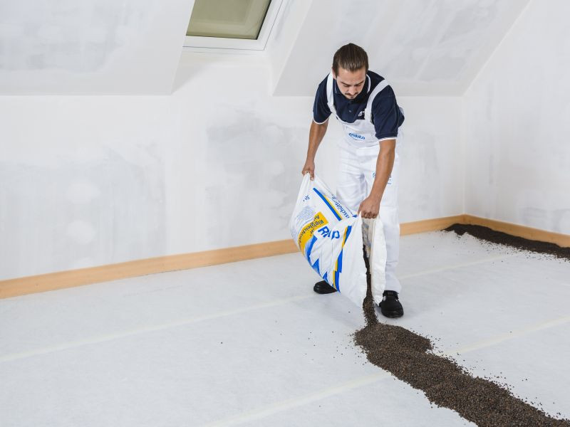 Nerovnosti podlahy větší než 10 mm vyrovnáme podsypem (obr. 4). Ten nasypeme ve dvou paralelních řadách, které vyrovnáme do požadované výšky (max. 60 mm v jedné vrstvě). Poté na ně položíme vodící latě. Pomocí třetí latě, kterou usadíme na vodící latě, vyrovnáváme podsyp do rovné plochy (obr. 5). Kročejová izolace nesmí být položena přímo na podsypu, jelikož z dlouhodobého hlediska by mohlo dojít k vtlačování podsypu do měkčí kročejové izolace a tedy k sedání celé podlahy. Proto použijeme nejprve roznášecí desku (např. RigiStabil o tloušťce 12,5 mm), kterou volně položíme lícovým papírem na podsyp (obr. 6).