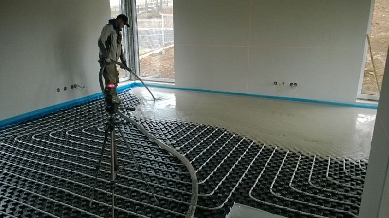 obr.: Aplikace litého potěru ANHYMENT na plochu s podlahovým vytápěním.