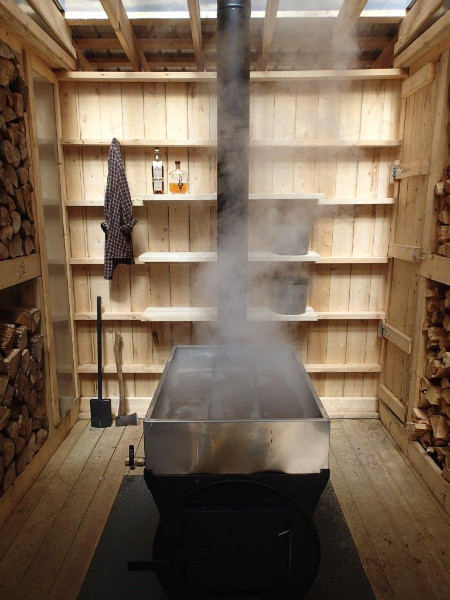Každý, kdo si staví dům z jakéhokoliv materiálu, chce, aby nová stavba vydržela co nejdéle. Palírna javorového sirupu je v tomto směru jiná – nevydrží stát ve své původní podobě déle než pár dní, přesto to nikomu nevadí. Proč? „Jde o konzumní dřevostavbu s klasickou rámovou konstrukcí," říká architekt Keith Moskow z bostonského studia Moskow Linn Architects Inc. „Místo sendvičového souvrství jsme ale obvodové stěny vyplnili vyskládanými polínky, která se v průběhu pálení sirupu postupně odebírají."